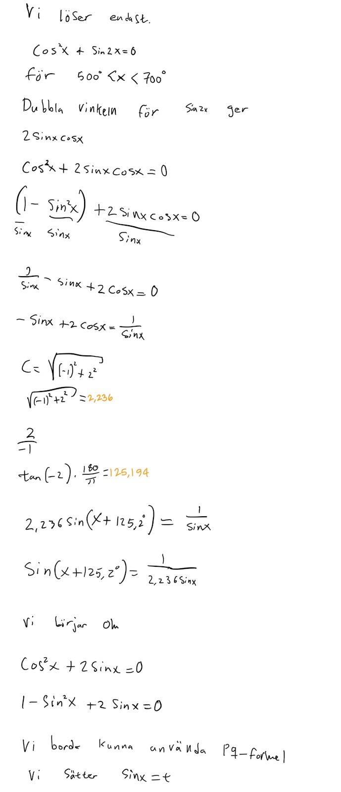 I ditt första försök löser du ekvationen med sin(2x)\sin (2x), i den andra med 2sinx2\sin x. Vilken är rätt ekvation?