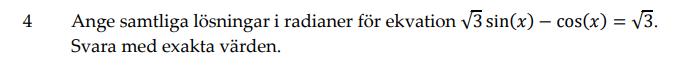 Laguna skrev:Du får skriva om uttrycket med hjälp av additionsformeln för sin eller cos, baklänges så att säga.