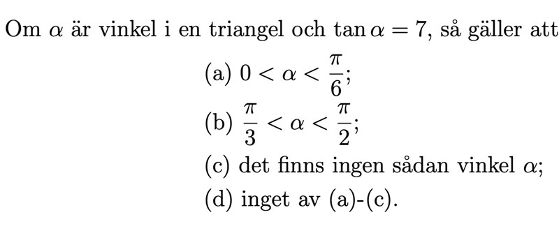 tan x är positiv i första och tredje kvadranten eftersom vinklar större än 90 grader inte finns bland alternativen då är vi i första kvadranten men då skulle både a och b kunna stämma eftersom blir positiv där också (koordinaterna är positiva). Mitt svar hade varit som inte är med och därför valde jag alternativ d som är fel enligt facit men jag förstår inte varför.