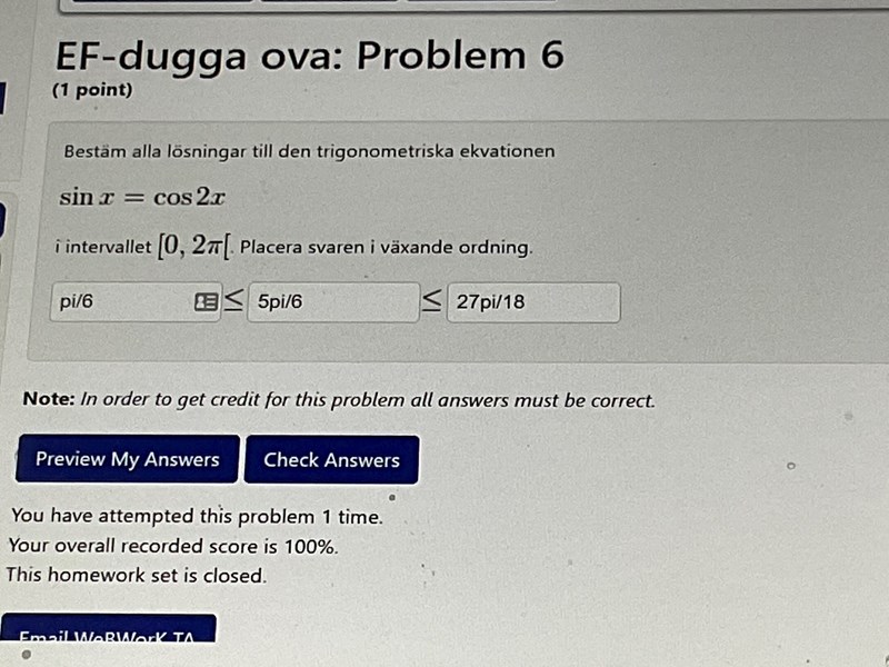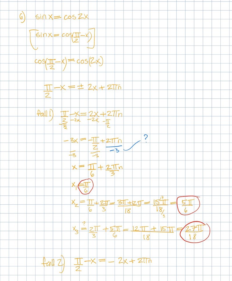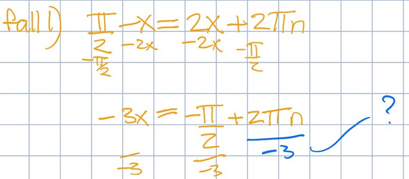 Det här är uppgiften och mitt svar som blir rätt. Fall ett gav mig alla svaren som jag behövde. Jag fick alltså rätt när jag inte delade med -3 på termen 2pi*n. Men det känns konstigt att inte dela med -3. Men antar att det är rätt att inte dela med -3? Tack för snabbt svar!