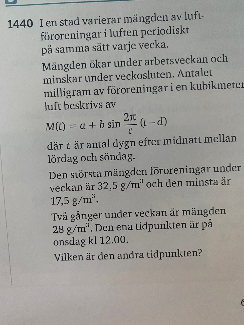 Sätt in allt du vet i ekvationen och lös den. (Du bör kunna klura ut värdet på konstanten c också, eftersom du vet att funktionens period är en vecka.) Om du behöver mer hjälp, så visa hur långt du har kommit och fråga igen.