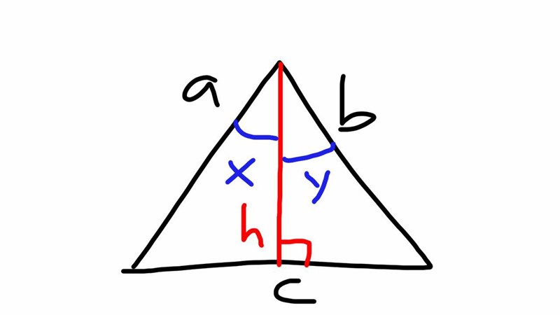 Om vi drar höjden h och kallar vinklarna till höjden x och y så blir det som i figuren nedan.