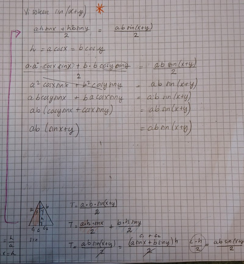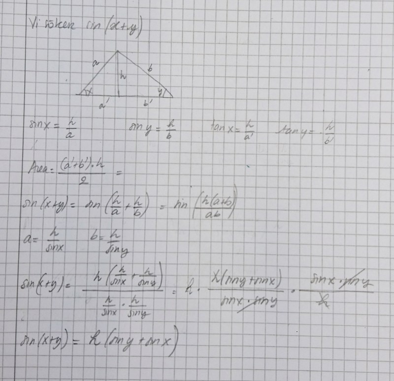Additionsformeln för sinus kan man få genom att titta på arean av en delad triangel. Yngve visade dig det för några månader sedan, tror jag.