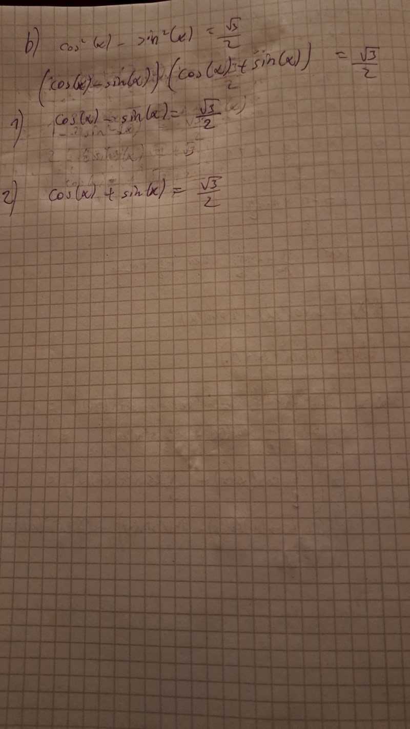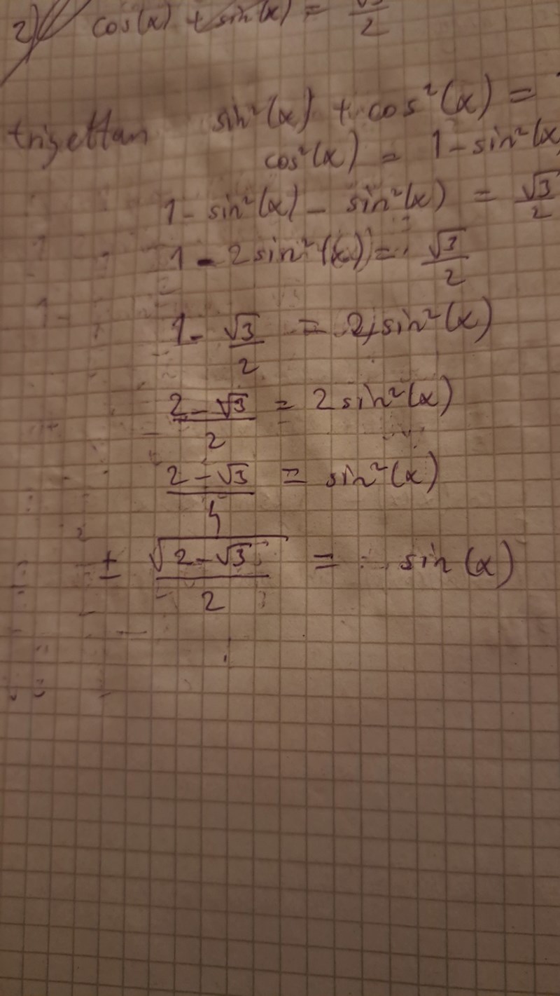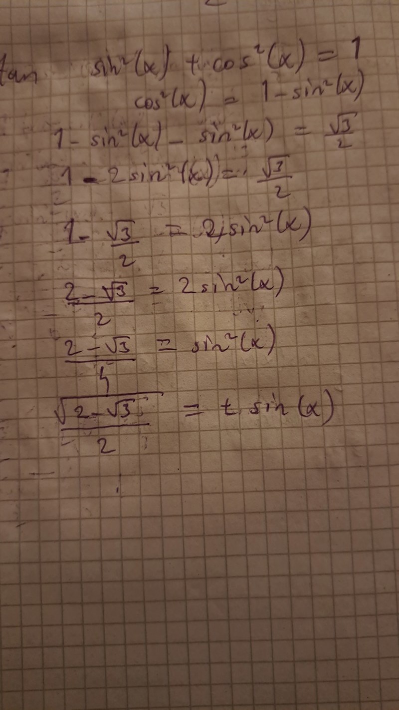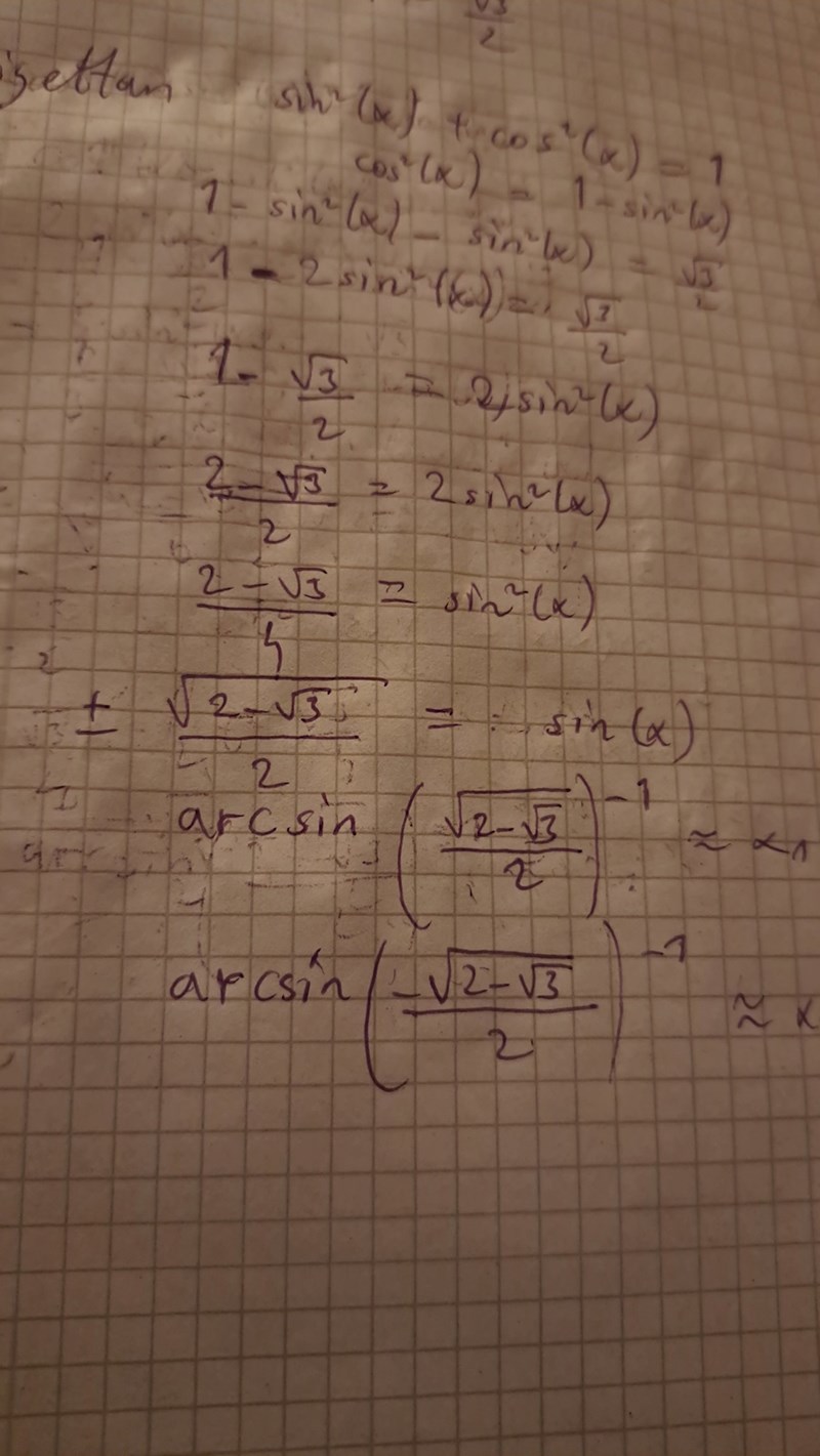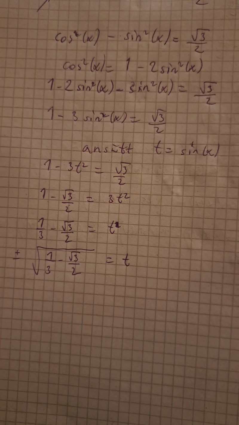 Jag försökte med det med cos men får inget annat än 1-sin^2x-sin^2x på VL. Då får jag 1-2sin^(x)=sqrt(3)/2. Använder vi substitution med t får vi då sinx=t