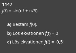 Hej, jag har fastnat på b. Jag tänkte när blir funktionen = 0. Det är när det är 0 grader eller 180. Då tog jag pi*t + pi/3= 0. t=1/3.