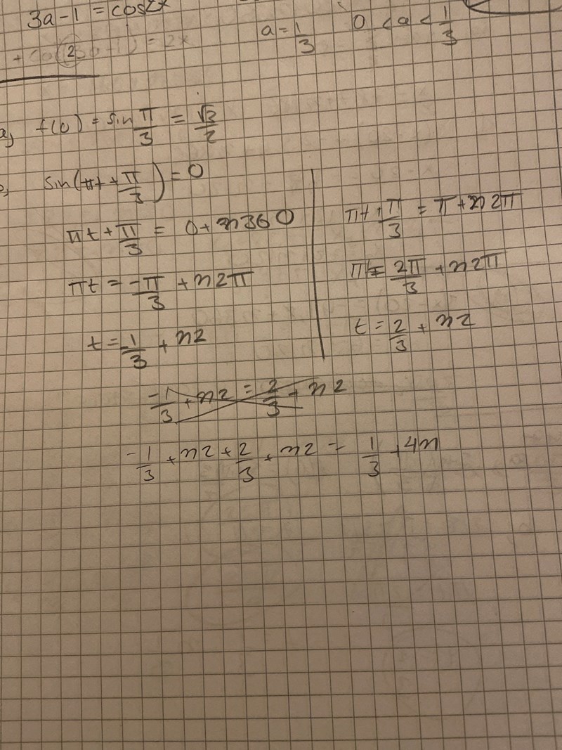 Sedan gjorde jag samma sak på 180 grader och fick fram t=2/3. DÅ tänkte jag nästa gång sin är 0 är det efter 1/3. Svaret borde vara 1/3+n*1/3. Helt ärligt vet jag inte hur jag ska göra så jag kan vara helt ute och cyklar.