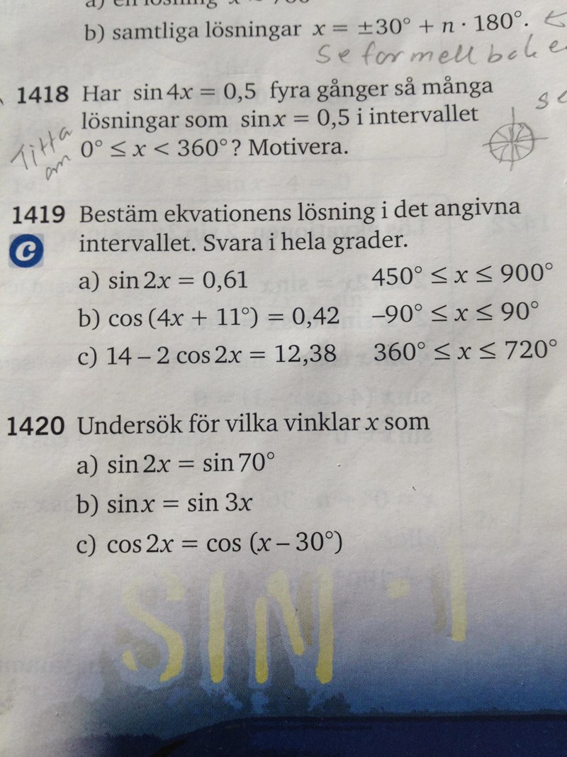Tänk på att det alltid finns två lösningar per varv för sin och cos funktioner