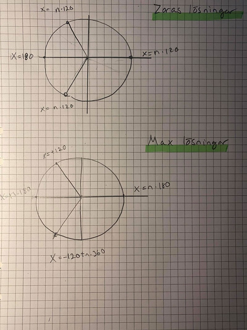 Rita upp två enhetscirklar. Rita in Zaras lösningar i den ena. Rita in Max lösningar i den andra. Om du behöver mer hjälp så lägg upp din bild här.