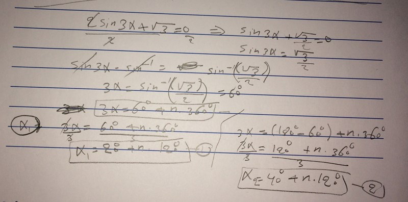 Kolla på enhetcirkel då har vi: 3x=n.360-60 eller 3x=(2n-1).360+60