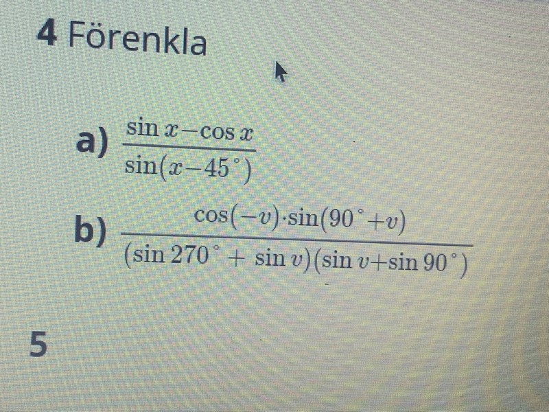 1. Rubriken är "Trigonometriska ekvationer" men vare sig a) eller b) är en ekvation. De är bara trigonometriska uttryck. V g komplettera så att uppgift och rubrik stämmer överens.