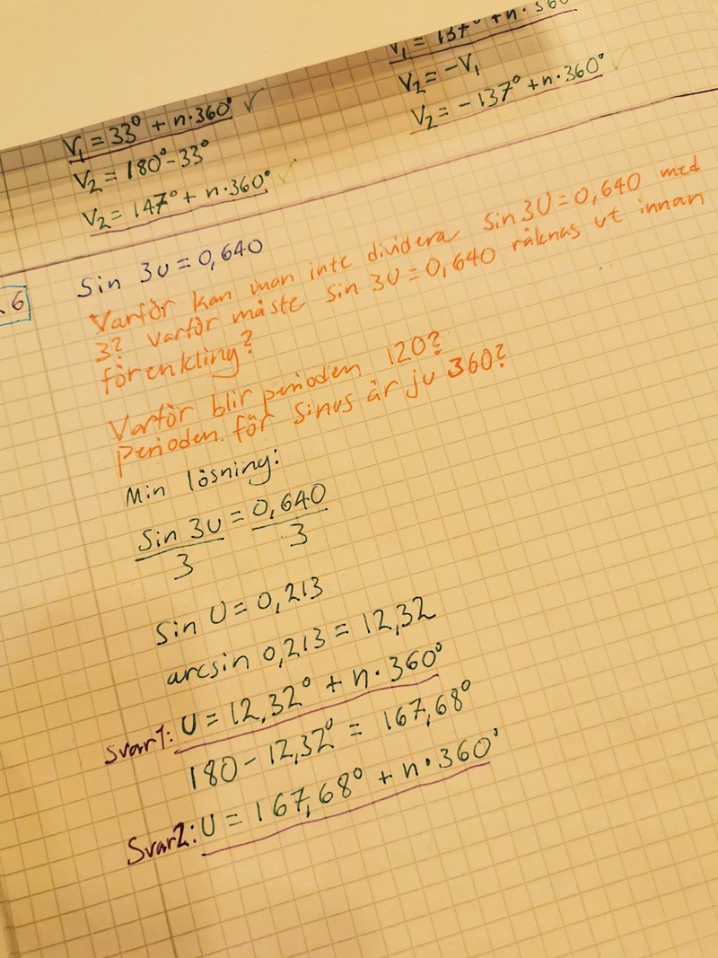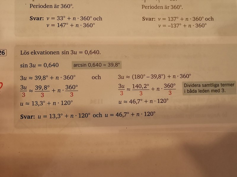 Jag förstår inte varför lösningen i boken mer nye börjar med att bryta ut u, och varför perioden sen då blir 120°. Perioden för sinus ska ju vara 360°, då är det väl ännu mer orimligt att man börjar med att först räkna ut sin 3u istället för att se till att u blir ensamt? Förstår inte alls upplägget på den här uppgiften. Eller är båda svar rätt?