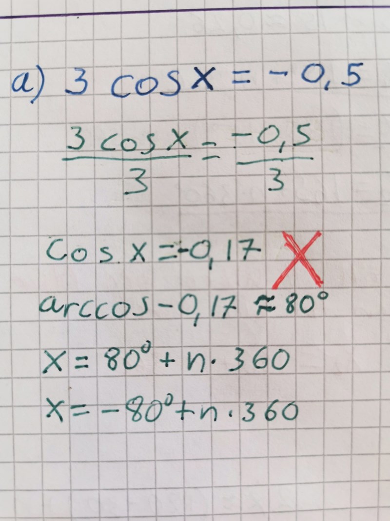 Jag fick svaret arccos -0.5 = -0,1666666667, vilket jag avrundade till -0,17. Om jag istället bara i miniräknaren tar arccos (answer) så blir det 99,594... Alltså 100. Förståeligt.