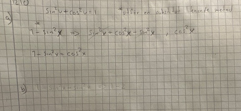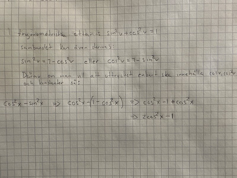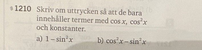 För b, tänk på att trigonometriska ettan säger att . Eftersom målet med uppgiften är att skriva uttrycken bara med cosinus kan du försöka hitta ett uttryck med hjälp av trigettan som är lika med . Sedan kan du byta ut sinus i b) mot detta nya uttryck.