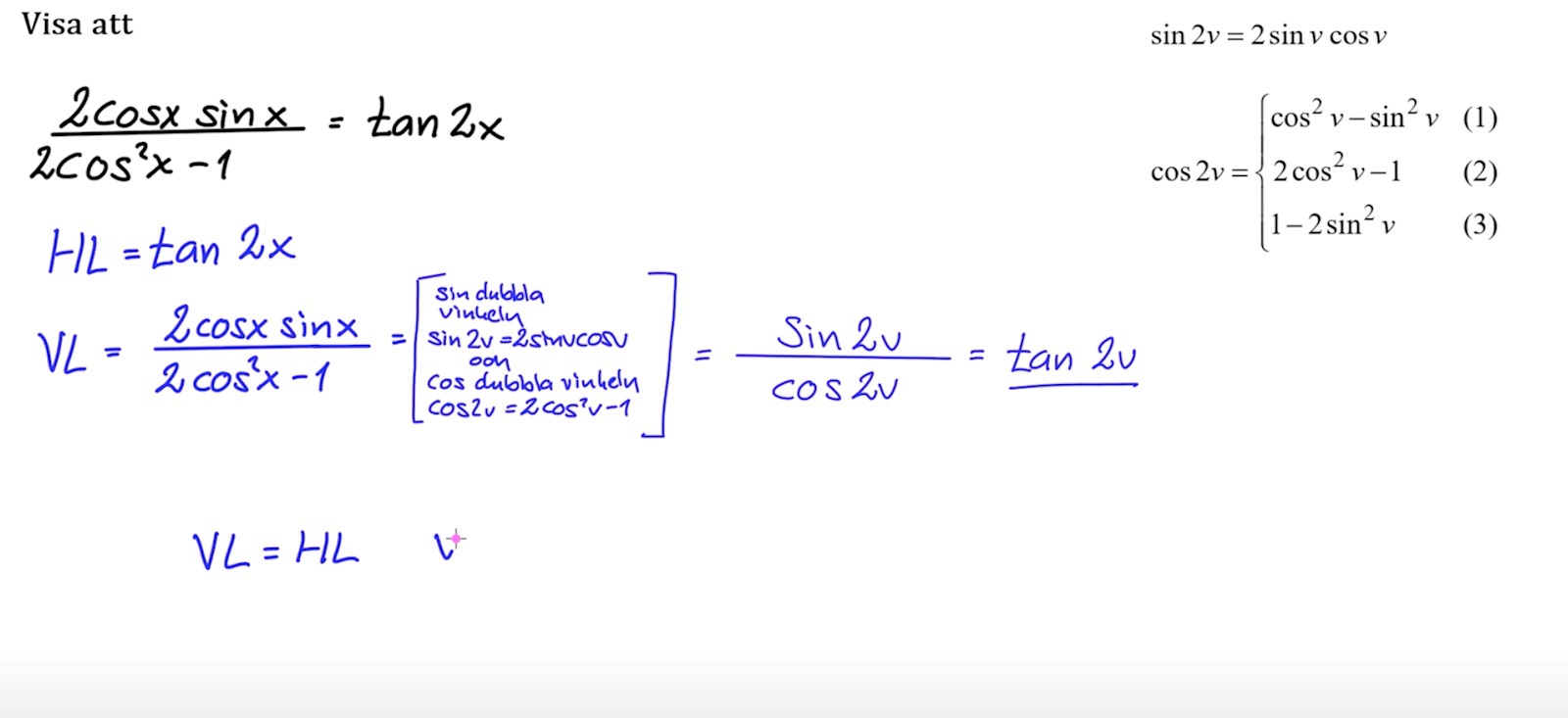Hej! Jag förstår inte överhuvudtaget hur de får jag förstår helt i nämnaren men jag ser inte hur täljaren blir sin2v. Vad är det som sker här exakt? Och hur skulle man kunna skriva om 2tan? Är det 2?