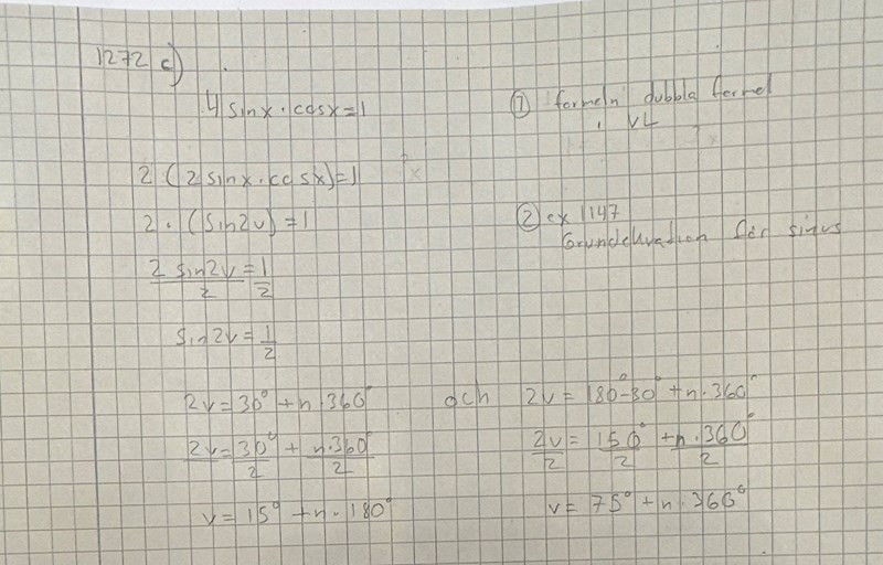 Man börjar med formler för dubbla vinklar 2sin2x=2sinxcos