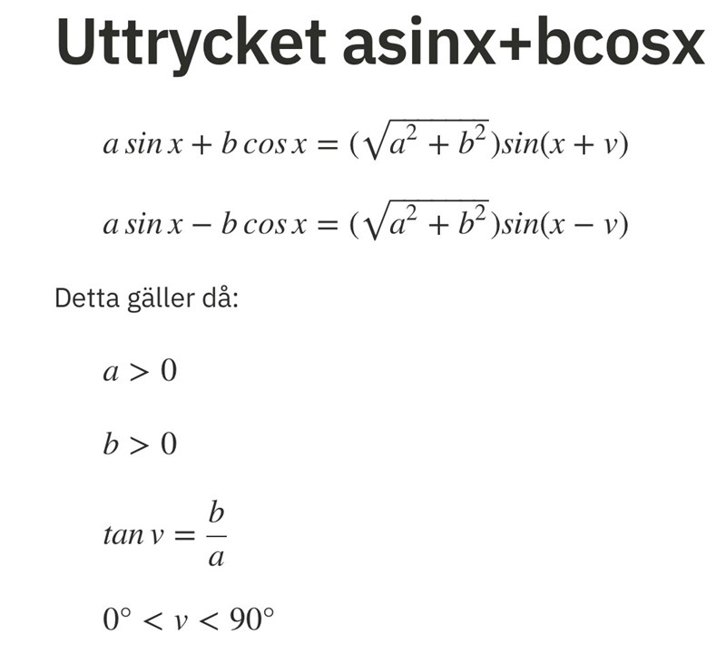 Uträkningen är inte min och därmed förstod jag ej varför det blev asinx+bsinx när formeln är i uppgiften asinx+bcosx, men det du la in gynnade mig faktiskt. Så är detta en regel inom denna formel? Aldrig sett den tidigare och det är första uppgiften jag stöter på med denna funktion.