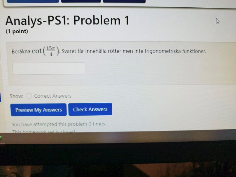 Rita upp en hjälptriangel med två kateter som är 1. Vad blir vinklarna och således cotangensvärdet för den? Cotangens är tangens invers så den är förhållandet mellan närliggande genom motstående katet.