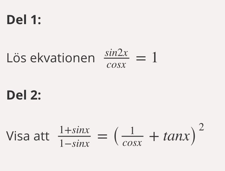 Angående den första: Känner du till någon identitet som kanske skulle kunna förenkla sin(2x)\sin(2x)?