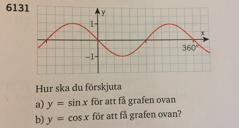 Titta på vilken period funktionen har (), precis som sinx och cosx har. Sinuskurvan "börjar" på och går sedan uppåt. Hur mycket måste du flytta grafen i sidled för att det ska stämma?