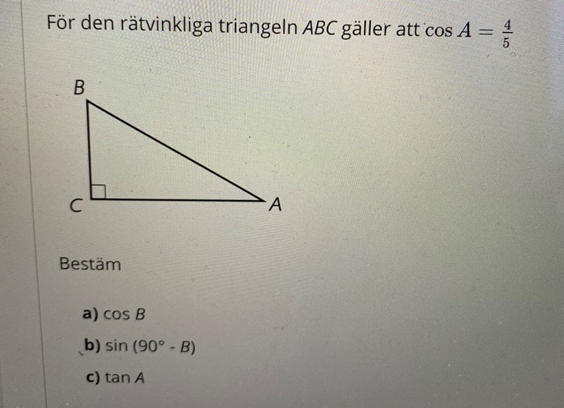 Om vi utgår från vinkeln B: Hypotenusan = 5 le, närliggande katet = 3 le, motstående katet = 4 le.