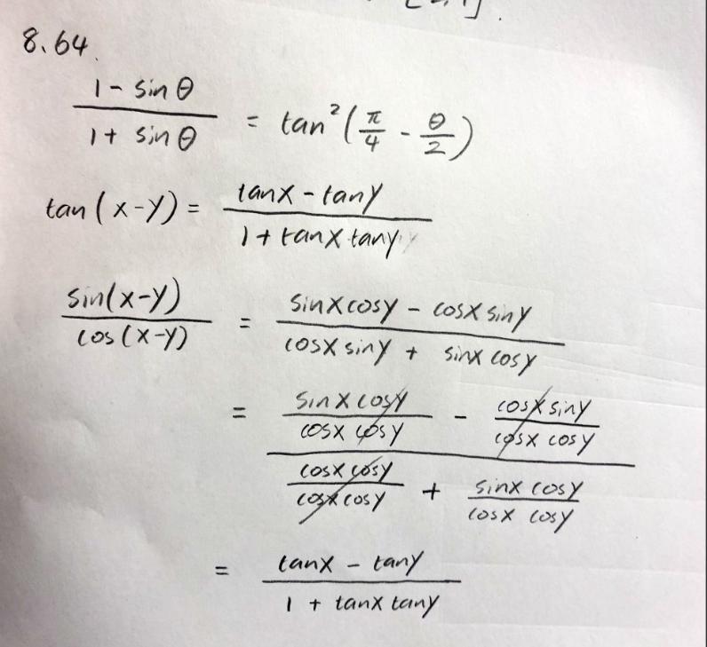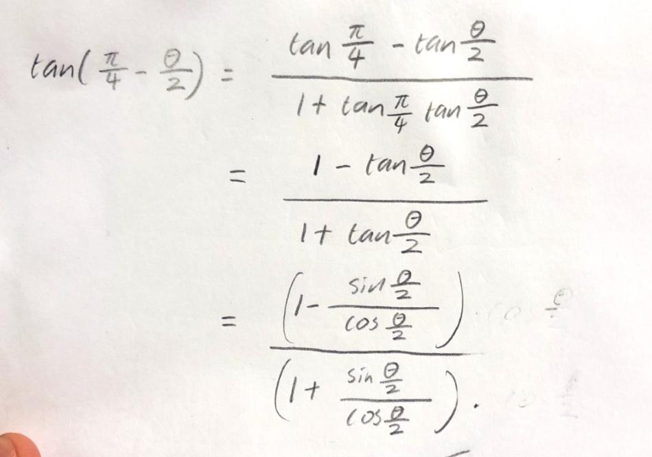 tan2(π4-θ2) =tan2(π4-x)=tan(π4)-tan(x)1+tan(π4)·tan(x)2= 1-tan(x)1+tan(x)2=cos(x)-sin(x)cos(x)+sin(x)2== sin2(x)+cos2(x)-2sin(x)cos(x)sin2(x)+cos2(x)+2sin(x)cos(x)=1-2sin(x)cos(x)1+2sin(x)cos(x)=1-sin(2x)1+sin(2x)=1-sin(θ)1+sin(θ) QED