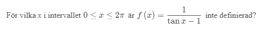 Hittar inte svaret igen då jag hämtade frågan från en extern hemsida. Men jag minns nog att 3pi/2 var ett av svaren tror jag. Kan ha varit det motsatta också. Jag tror det kan ha och göra med att tan x kan skrivas som en kvot mellan sin x och cos x. Men det är konstigt, det borde generera samma svar som att skriva tan x =1