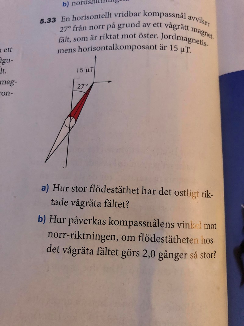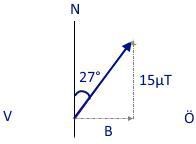 En horisontellt vridbar kompassnål avviker 27 från norr på grund av ett vågrätt magnetfält , som är riktat mot öster, Jordmagnetismens horisontella komposant är 15 T
