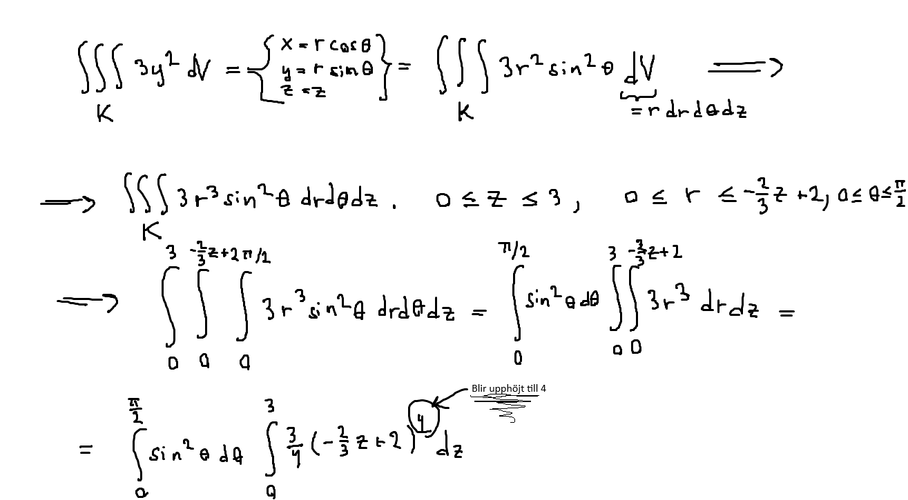 Deluppgiften va att ändra till cylindriska kordinater. Jag gjorde såhär 0<r<-2/3z+2 , 0 <theta <pi/2 och 0< z<3, Jag ser dock inte hur ordningen drd0dz skulle fungera då integralen län st ut inte ska innehålla några variabler för lösningen i bilden.