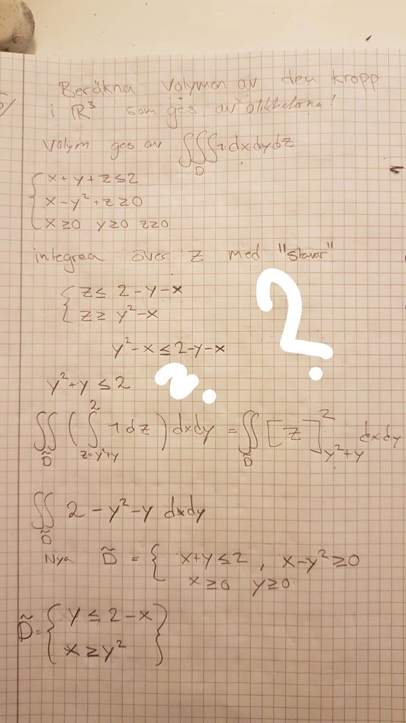 Så egentligen det jag behöver hjälp med är. Om jag ska lösa trippelintegralen genom att sätta först en dubbelintegral och innerst en enkelintegral. Hur blir den integrationen i z-led och vad får jag för gränser.. 🤔🤔