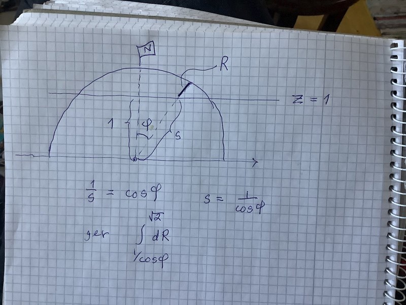Tack, men jag förstår inte riktigt då hur R kan bli sprt(2) om det är S i din bild som är 1/cos(fi). Då tänker jag att R blir sqrt(2)-1 om det bara är den färgade övre delen i din bild som är R. Jag förstår fortfarande inte riktigt bildligt vad R är, och hur den varierar. Nu tycker jag det ser ut som att S är 1/cod(fi) och R något annat.