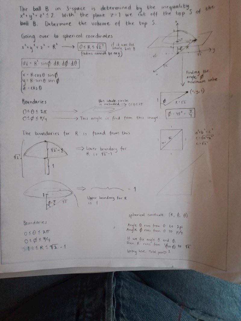 Bubo, jag håller inte med. Klotet har radie roten ur 2 och skärs av ett plan som ligger 1 längdenhet från centrum. På Olivias bild ser du att det bara är biten bortom planet (från centrum) som man söker volymen för, inte för halvklotet. Hur stor del av radien som ska vara med beror av vilken vinkel strålen bildar med z-axeln.