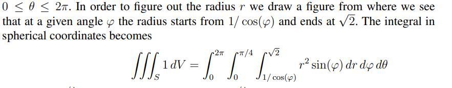 Vi vill veta volymen av segmentet. Då tänker vi oss ett strålknippe ut från origo till klotytan. Betrakta en stråle med vinkeln fi från z-axeln. Den träffar snittytan på avståndet 1/ cos fi från origo (se min fig). Så när vi integrerar med avseende på r så är undre gränsen 1/cos fi och övre gränsen roten ur 2.