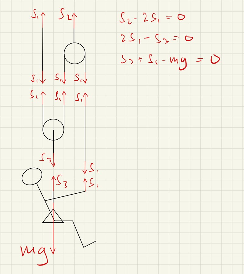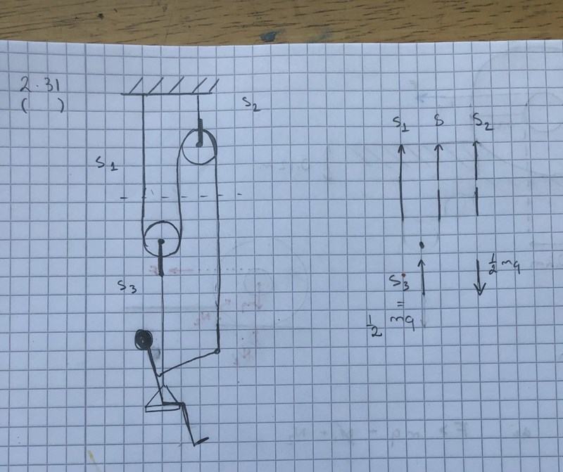 Tänkte först att S3 skulle vara hälften av mg eftersom han behöver hålla sig uppe genom att dra. Tidigare uppgifter har det endast funnits en kraft neråt och då har alla spännkrafter varit lika stora. Så är det ju inte nu, hur kan jag tänka?