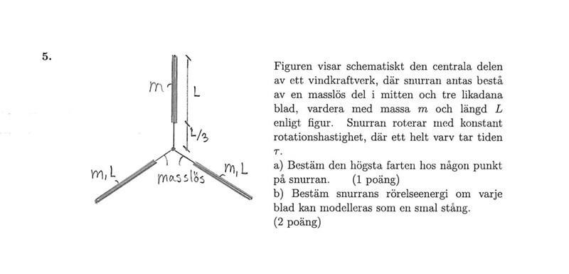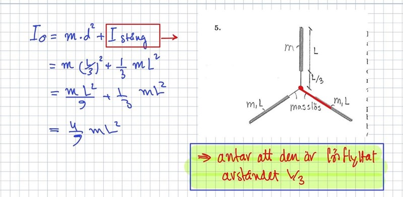 Min motivering till min lösning är att om bladet låg i centrum (kolla bilden i min lösning) då skulle tröghetsmomentet vara 1/3 mL², men eftersom det är förflyttat L/3 så blir adderar vi + m * (L/3)²