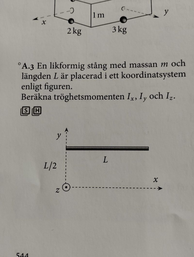 Men när jag ska gå vidare och beräkna Ix, tröghetsmoment runt x-axeln, så blir det bara fel. Jag tänker att massan borde ju bli samma som ovan, dvs hela stångens massa gånger varje liten bit dy:s längd; . Men jag fattar inte riktigt vad d ska vara och sedan vad det blir för integrationsgränser.