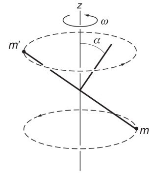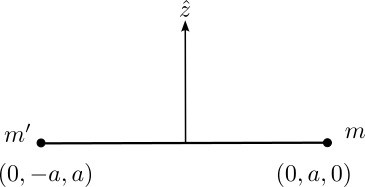 Koordinatsystemet vi väljer att räkna i är sådant att stången ligger utmed y-axeln och massorna är symmetriskt placerade enligt figuren. x-axeln pekar ut från pappret mot oss som betraktare.