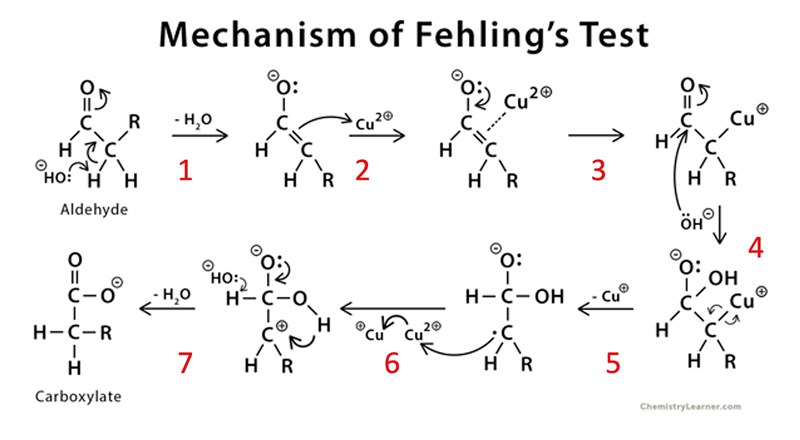 Steg 3: Ett av syrets fria elektronpar omlagras och återbildar dubbelbindningen till kolatomen, men nu kan inte enolens dubbelbindning ta upp en proton (för denna proton har hydroxidjonen försvunnit med), så istället skapas en bindning till kopparjonen som därmed får ta del av en elektron och reduceras till Cu+.