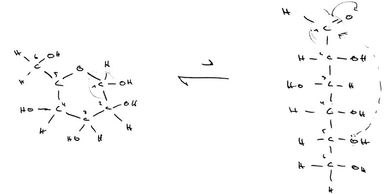 Inte en aldehydgrupp så långt ögat kan nå! Så hur kommer det sig att glukos är reducerande? Som du redan verkar ha lite koll på, så beror det på att i vattenlösning så är ca. 1 % av glukosringarna alltid öppna, och i den där öppna formen finns det en aldehydgrupp på kolatom nummer 1. Man säger att man har en kemisk jämvikt mellan de två formerna, så här:
