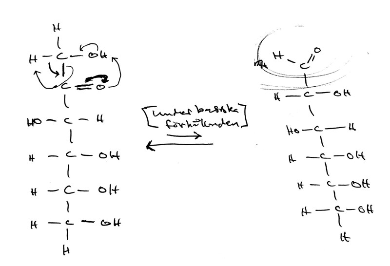 Men just i basisk miljö (såsom vid Trommers prov) har fruktosmolekylen ytterligare ett trick i rockärmen som den kan använda. Den kan nämligen kasta om vätejoner och elektronpar mellan atomerna i änden av molekylen på ett sådant sätt att den dubbelbundna syreatomen byter plats men en OH-grupp! (De små pilarna i strukturformeln indikerar hur elektronparen flyttar på sig under reaktionens gång; mer om detta får du lära dig om du läser Kemi 2 på gymnaiset.)