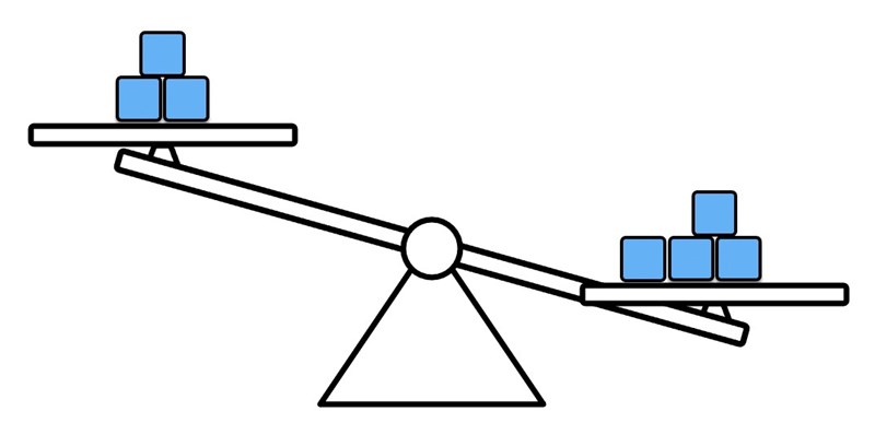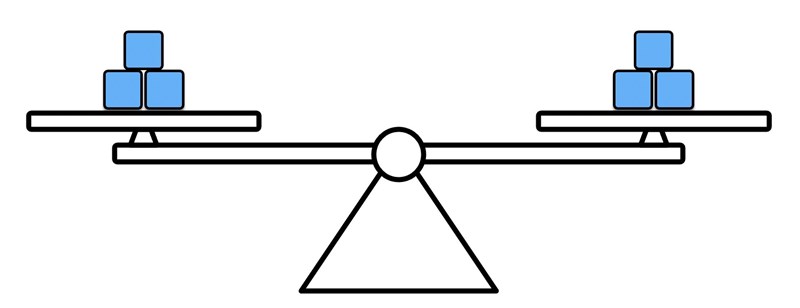 För att fortsätta eller avrunda vågskålen (beroende på om du vill fortsätta eller inte), är min poäng att du inte ska tänka i matematiska termer. Tanken är att bara tänka "fyra kuber är tyngre än tre kuber, så vågen är i obalans tills jag lägger till en kub på ena sidan". Ingen division, inga x eller y, bara "vågskålarna är i balans". :)