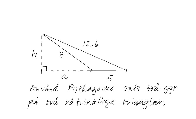 Det jag menar är, ifall jag använder pythagoras sats blir det väl x^2+5^2=8^2 eller hur ska jag använda pythagoras sats här, tacksam för hjälp :)