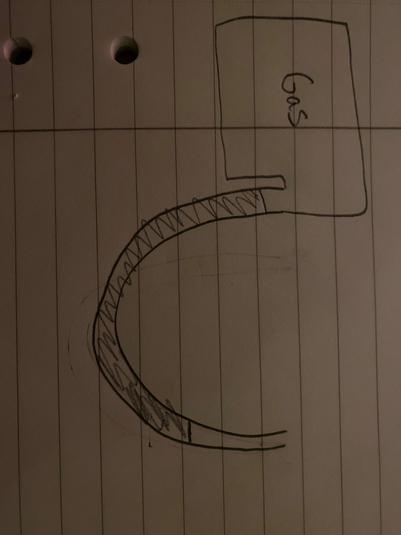 Titta på vätskeytan närmast gasbehållaren. Vätskan sugs inåt tills (lufttrycket + trycket från vätskepelaren) = trycket inuti gasbehållaren). Då blir det jämvikt.