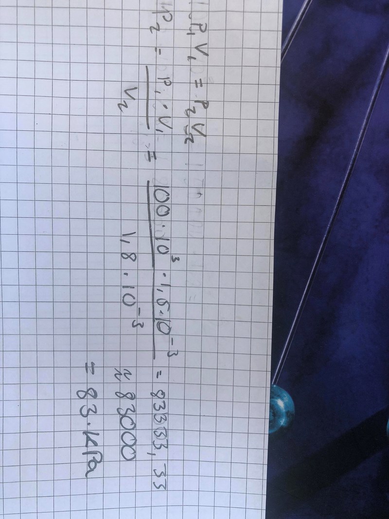 En metallcylinder med kolv innesluter en gas vara tryck är 100 kPa. Kolven förskjuts så att gasens volym ökar från 1500cm^3 till 1800cm^3, utan att dess temperatur ändras. Hur stort är tryckeri gasen nu?