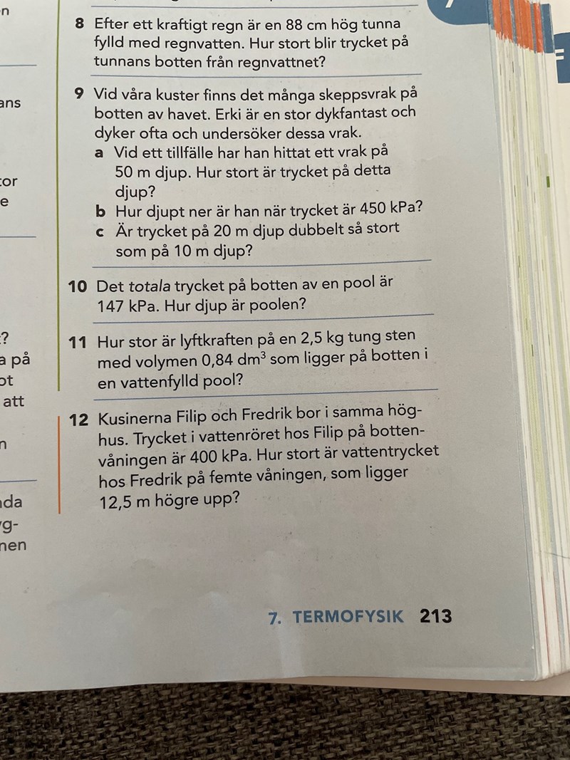 Hur löser man uppgift 12? Försöker använda formel för vätsketryck men blir fel.