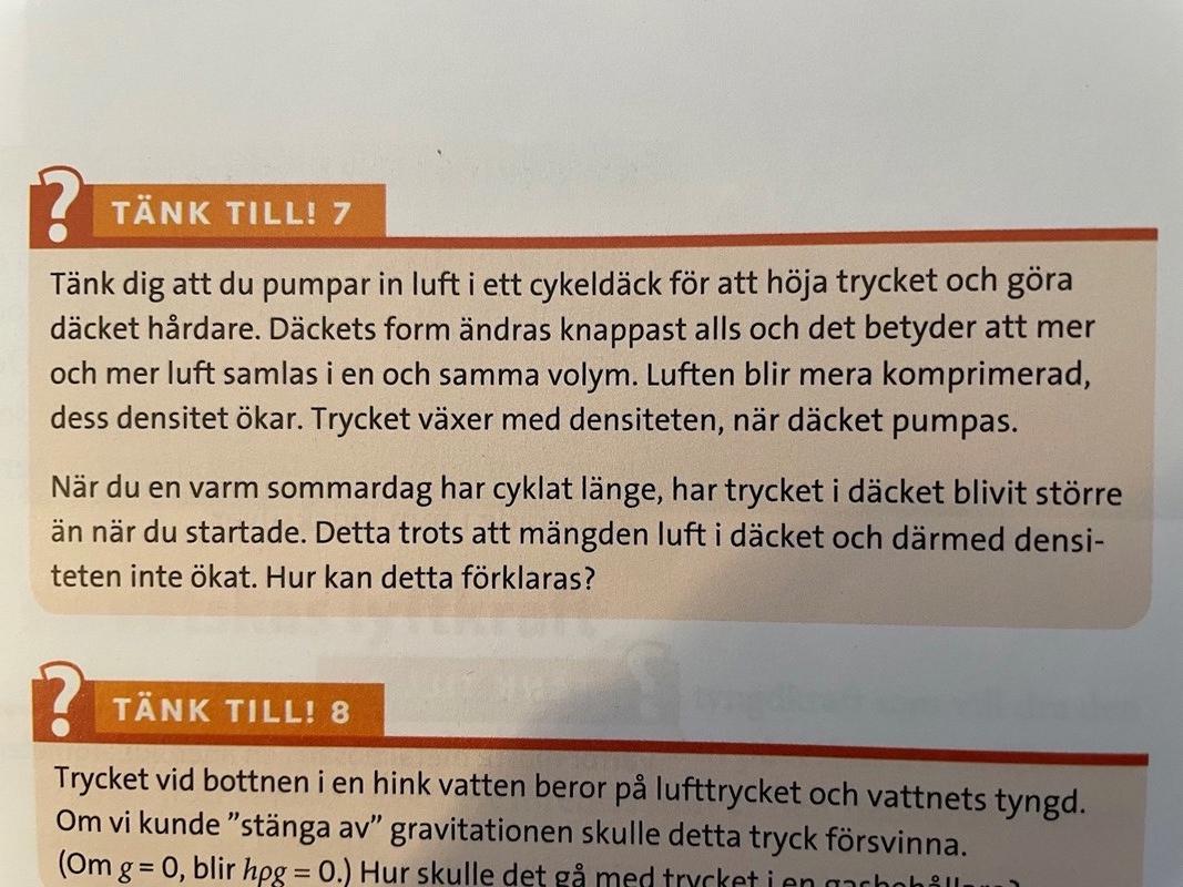 7. Den varma luften har lägre densitet än luften i cykeldäcket, vilket betyder att den innehåller färre luftmolekyler per volymenhet. Alltså kommer den varma luften att utöva ett mindre tryck på cykeldäckets ytskikt än luften inuti däcket. Då uppstår en tryckskillnad, som i sin tur orsakar ett övertryck. Övertrycket ger upphov till en resulterande kraft (riktad mot väggen inuti cykeldäcket). Den resulterande kraften gör att kvoten P = F/A växer (stötte täljare ger större kvot) och därför ökar trycket i däcket.