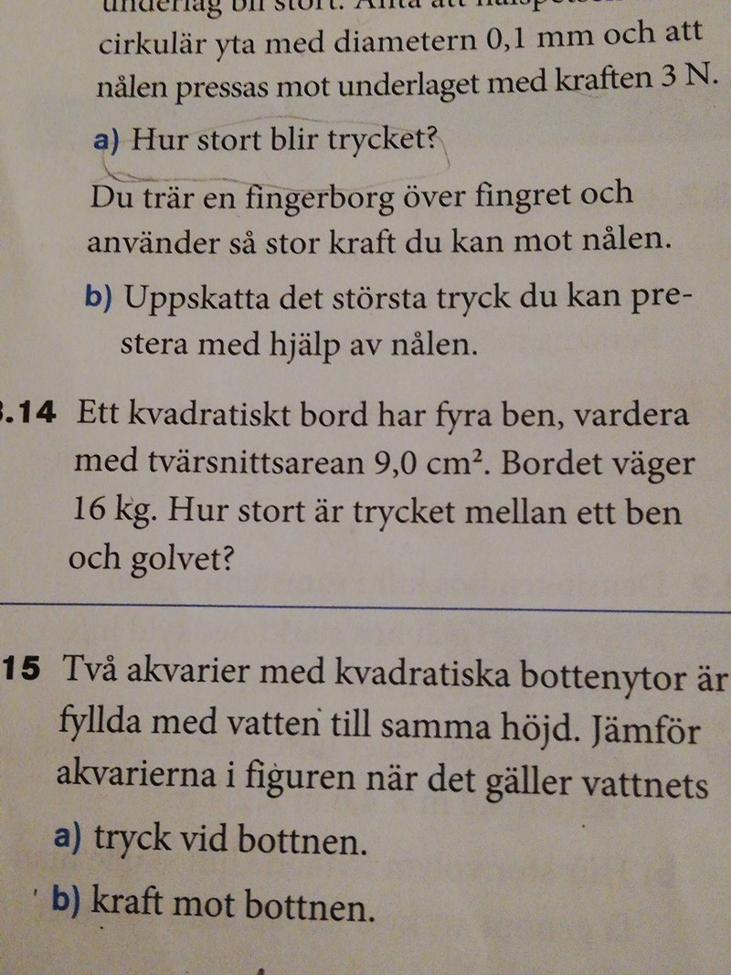 angående fråga 14. Jag hade en lösning för trycket mellan golvet och ett ben . Men tydligen är det fel och man ska räkna ut det totala trycket på alla ben? Har jag läst frågan fel???
