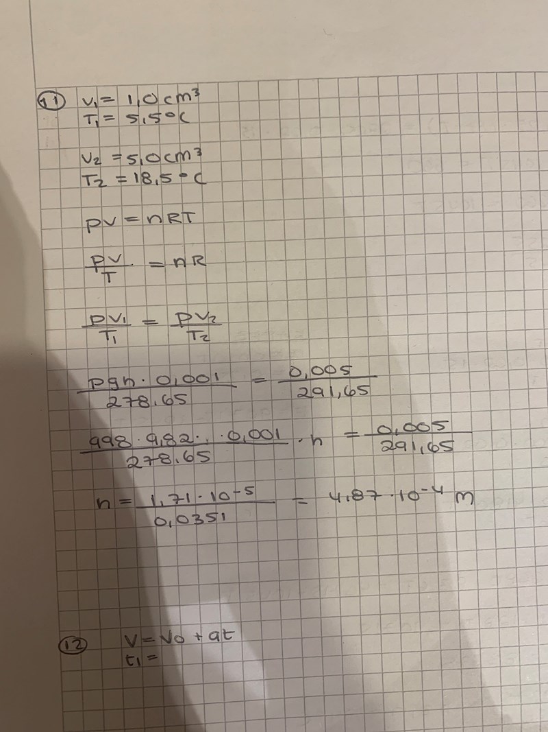 Det du kan göra i 11 är att jämföra pv/T vid botten och vid ytan. p är inte konstant. Däremot är nR det.