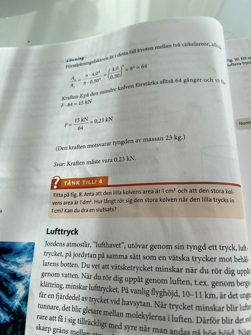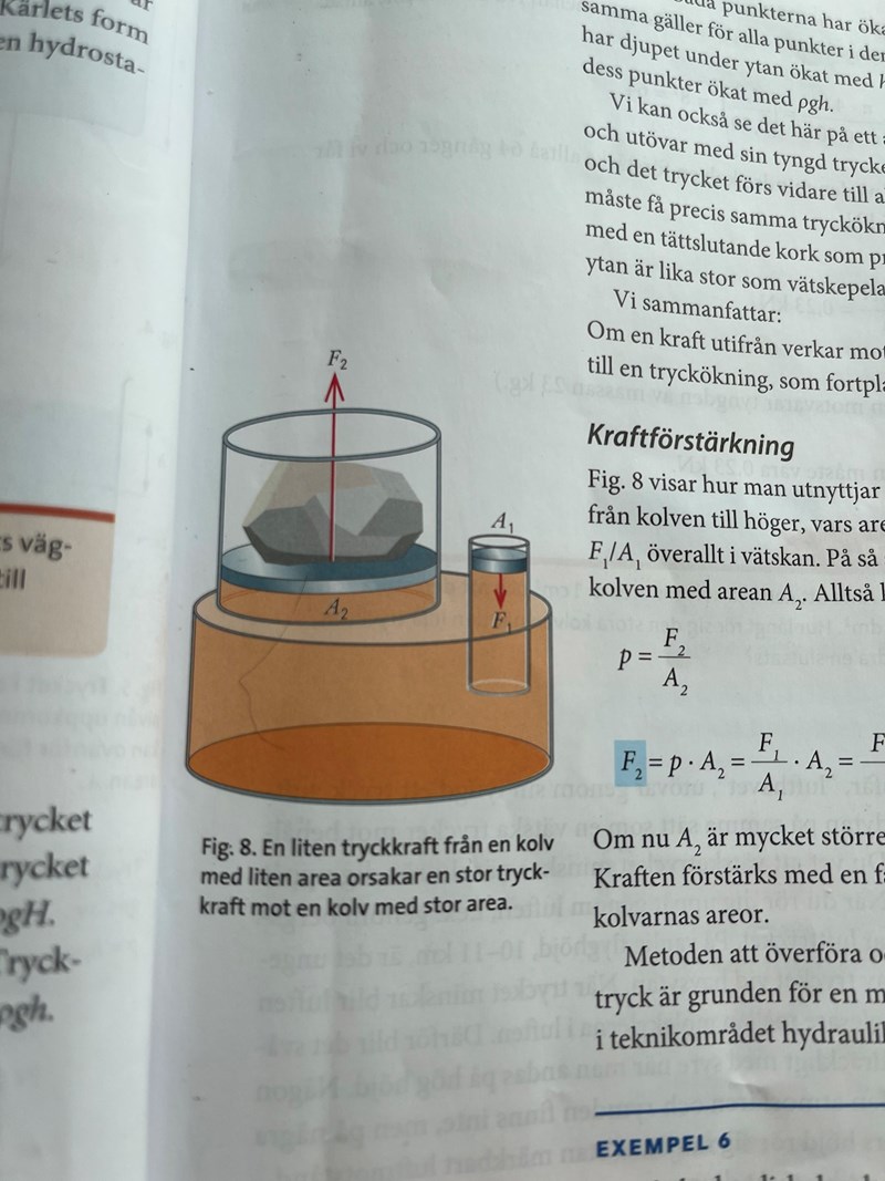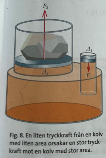 vi kan ju beräkna trycket från A1 med p=densiteten gånger g gånger h. Detta är även tryxket på A2. Då borde ju den större kolven lyftas lika jögt, vilket är fel. Hur får jag annars hur mycket den andra kolven lyfts