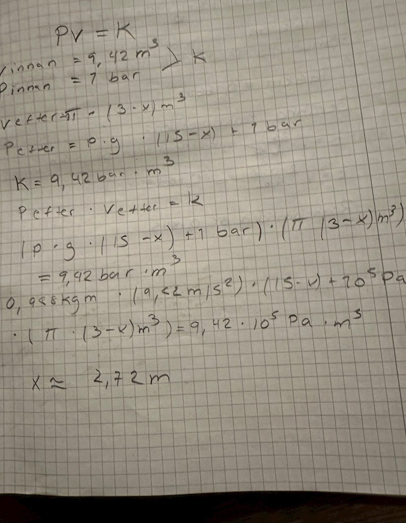 2. För att beräkna lufttrycket i dykklockan kan du också använda gaslagen, då får du ett annat uttryck som oxå innehåller x, vilket gör dt möjligt att lösa ut x.