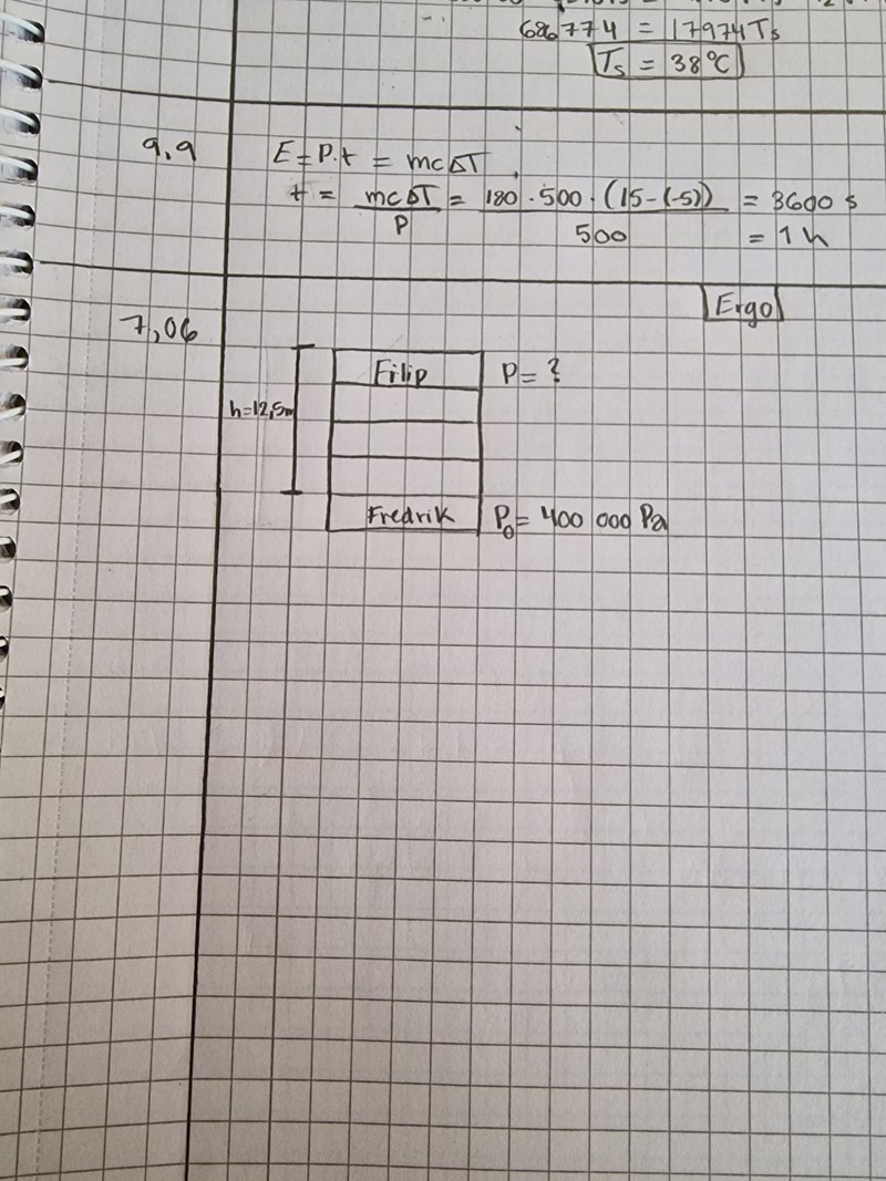 "Kusinerna Filip och Fredrik bor i samma höghus. Trycket i vattenröret hos Filip på bottenvåningen är 400 kPa. Hur stort är vattentrycket hos Fredrik på femte våningen som ligger 12,5 m högre upp?"